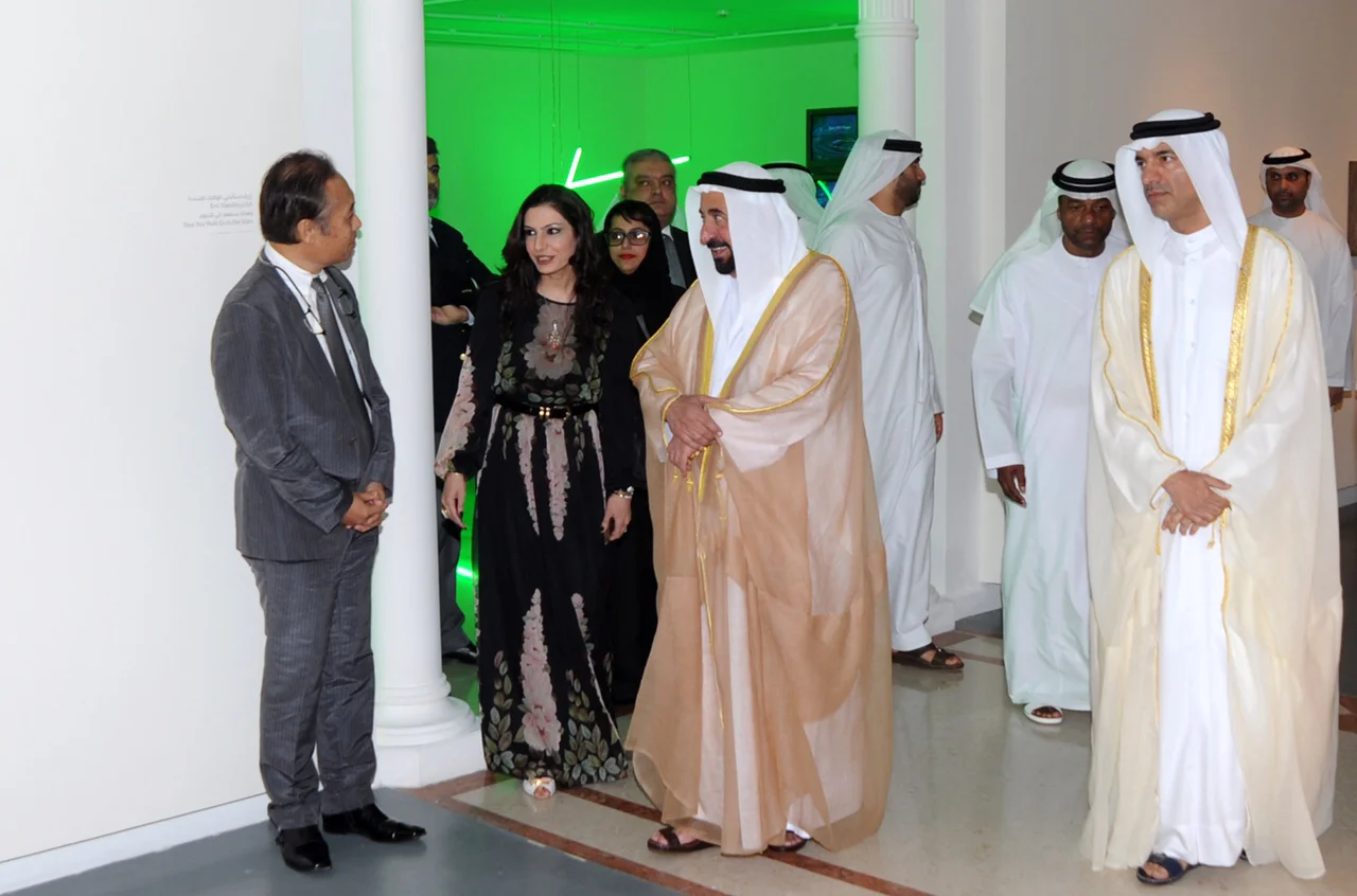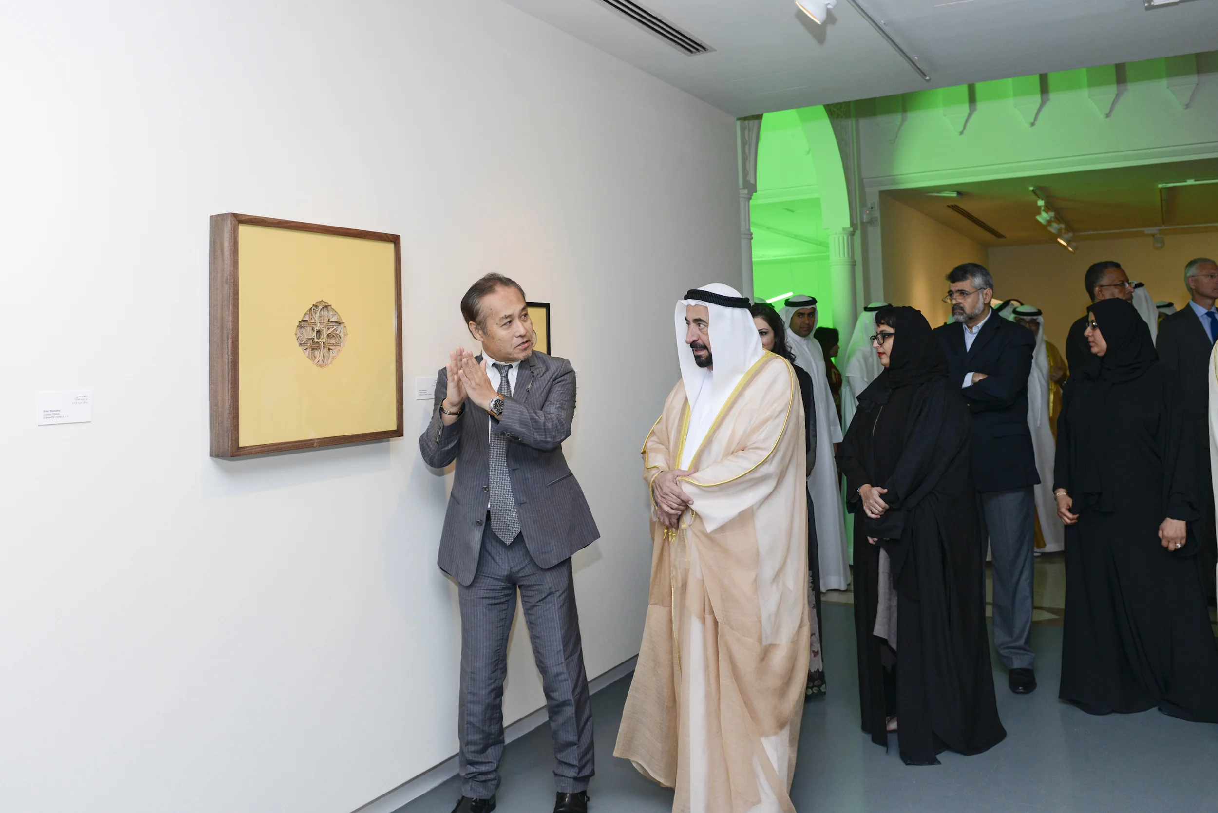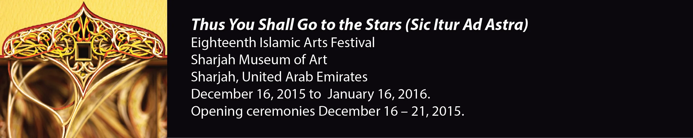 I am grateful to have been a part of the 18th Islamic Arts Festival in Sharjah, United Arab Emirates. My solo exhibit “Thus you shall go to the Stars” consisted of 23 works displayed at the Sharjah Art Museum December 17, 2015 to January 16, 2016. The 3 artworks Either/Or Delta, Epsilon and Zeta Orionis were made specifically for this exhibit. It was an honor to have his Highness Sheikh Dr. Sultan bin Mohammad Al Qasimi view the exhibit. I would like to thank my international agent Koji Miyajima (seen here explaining my work to His Highness) for making this exhibit happen, and to Farah Qasim for the invitation and for organizing all the festival events. My visit to Sharjah has impacted me deeply, of which I am endlessly appreciative to have met so many wonderful people and new friends.